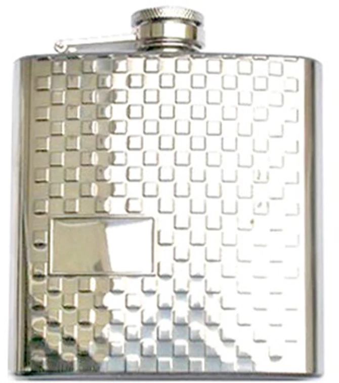 Fényes ezüst színű flaska, elején dombornyomott kocka mintával.