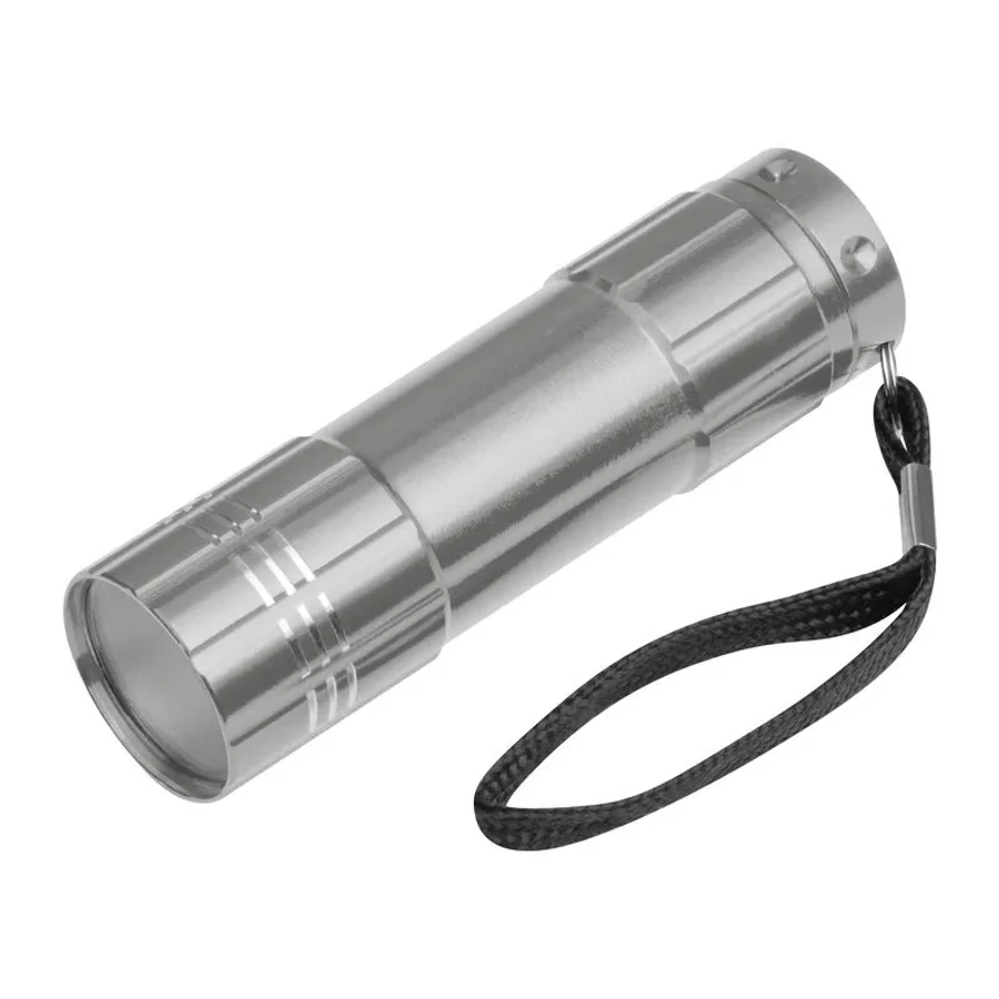 9 LED-es alumínium zseblámpa csuklóra akasztható zsinorral.