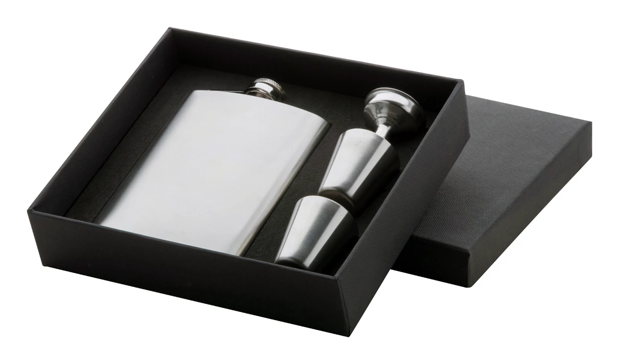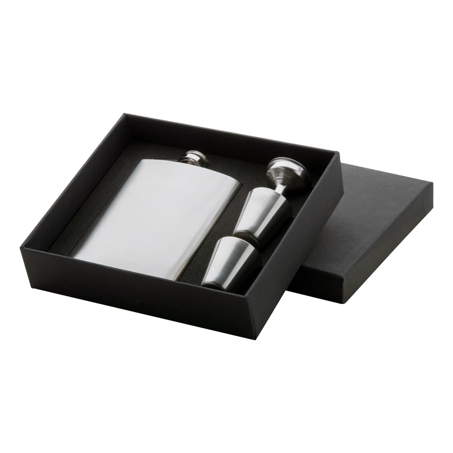 Rozsdamentes acél laposüveg szett tölcsérrel és 2 feles pohárral, 230 ml.