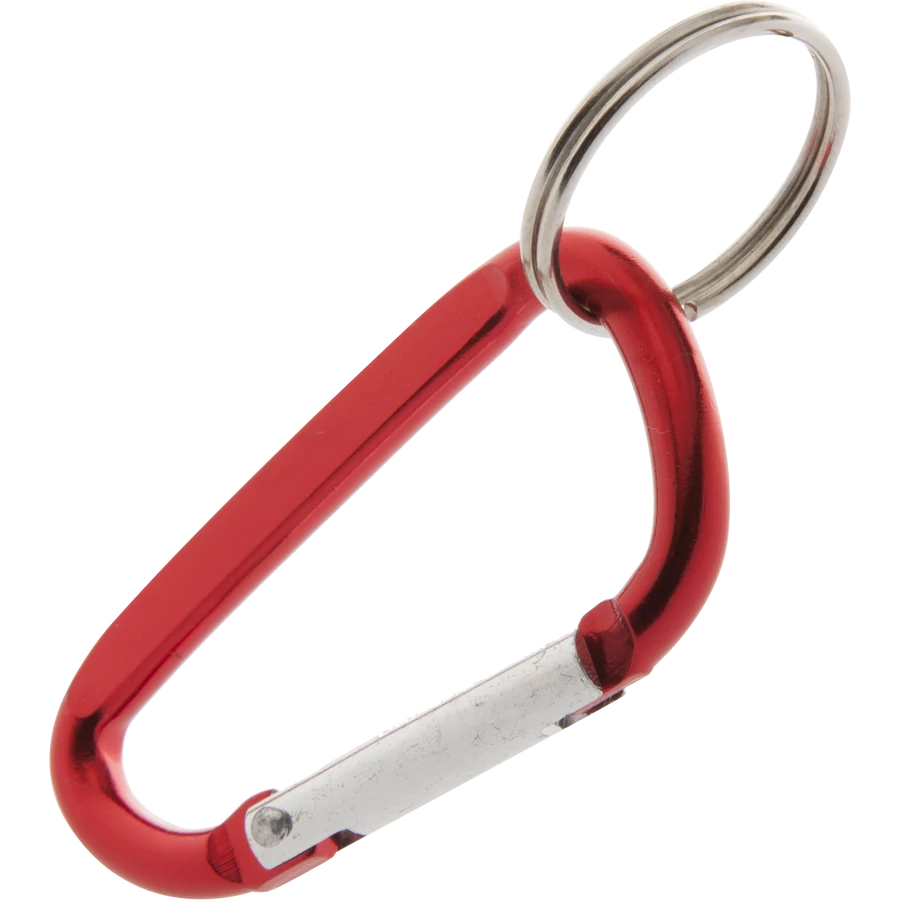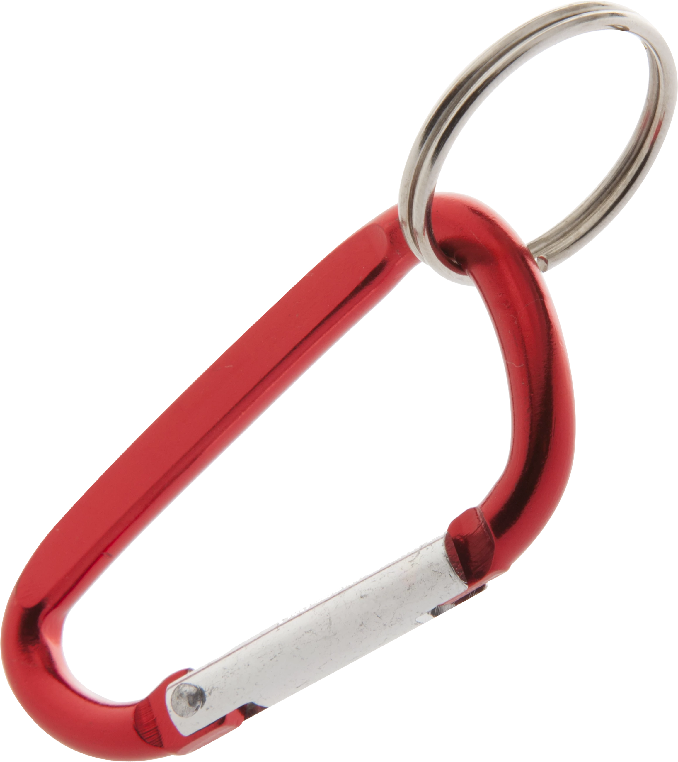 Újrahasznosított alumíniumból készült piros színű kulcstartó karabiner, karikával.