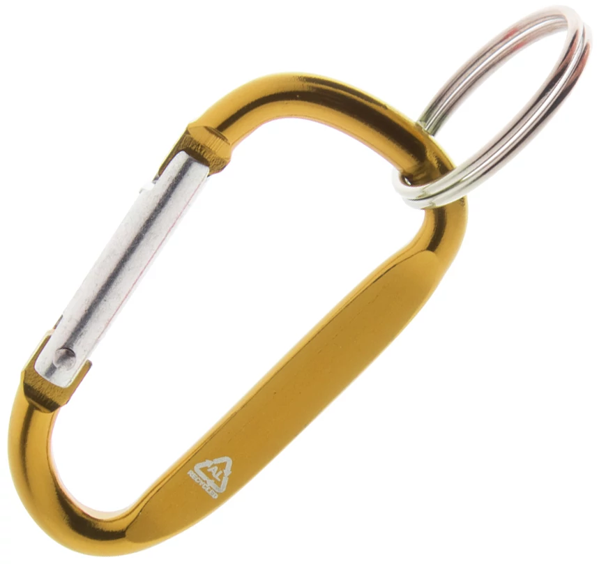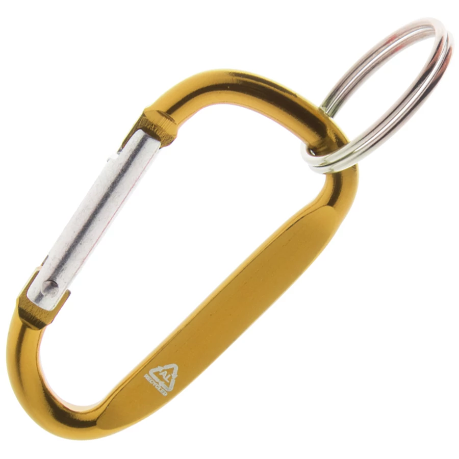 Újrahasznosított alumíniumból készült sárga színű kulcstartó karabiner, karikával.