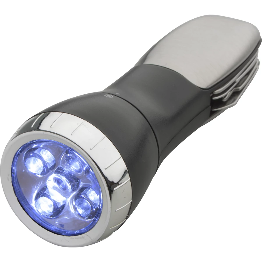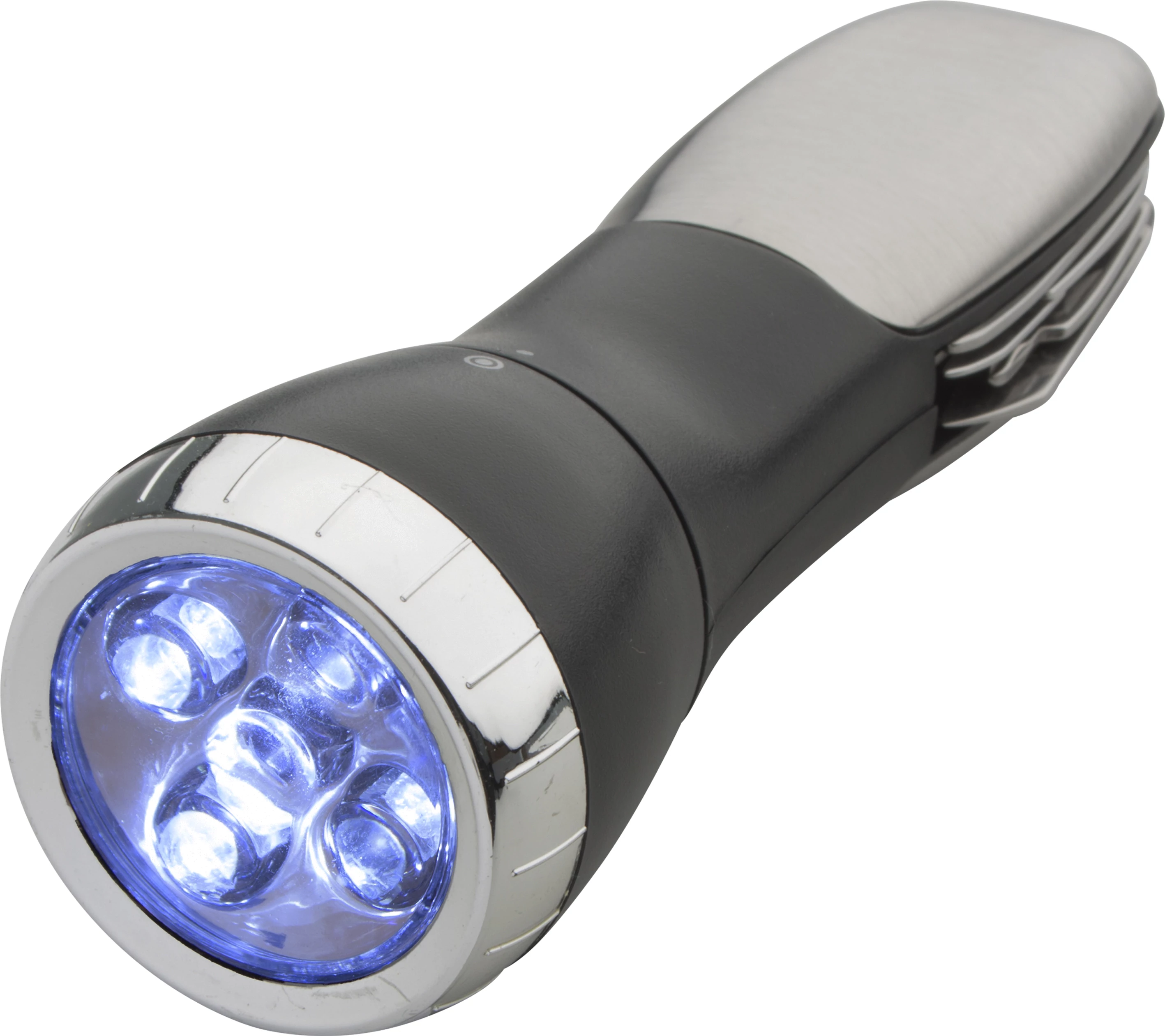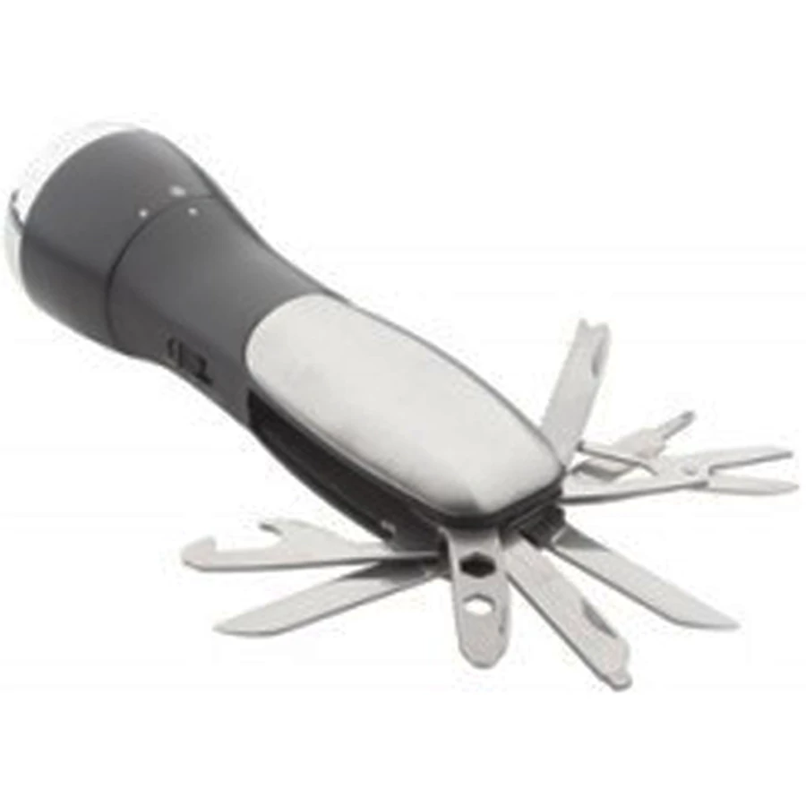 Multifunkciós zseblámpa,melynek végén 13 részes szerszámkészlet található,
