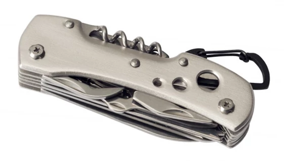 12 részes zsebkés: kés, fűrész, olló, konzervnyitó, csavarhúzó, üvegnyitó és hornyos csavarhúzó, csillagcsavarhúzó, lyukasztó és lyuktágító, varró eszköz, halpikkelyező, körömreszelő és karabiner.