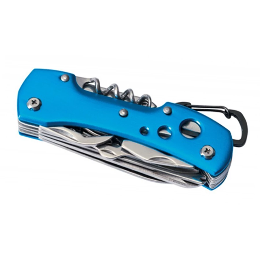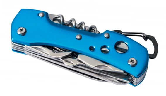 12 részes zsebkés: kés, fűrész, olló, konzervnyitó, csavarhúzó, üvegnyitó és hornyos csavarhúzó, csillagcsavarhúzó, lyukasztó és lyuktágító, varró eszköz, halpikkelyező, körömreszelő és karabiner.