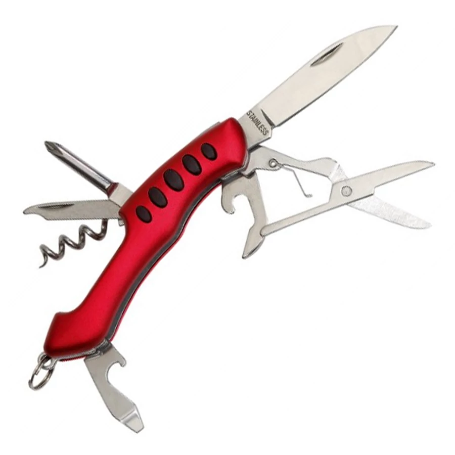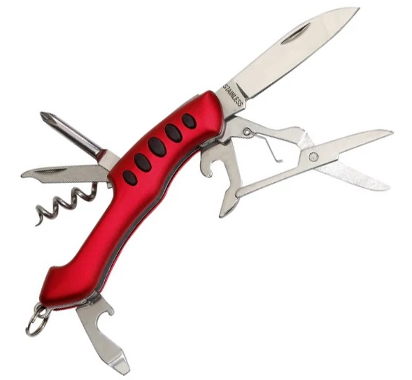 7 részes zsebkés olló, kétféle csavarhúzó, kés, üvegnyitó, konzervnyitó, kés, kulcstartóval, ajándékdobozban.