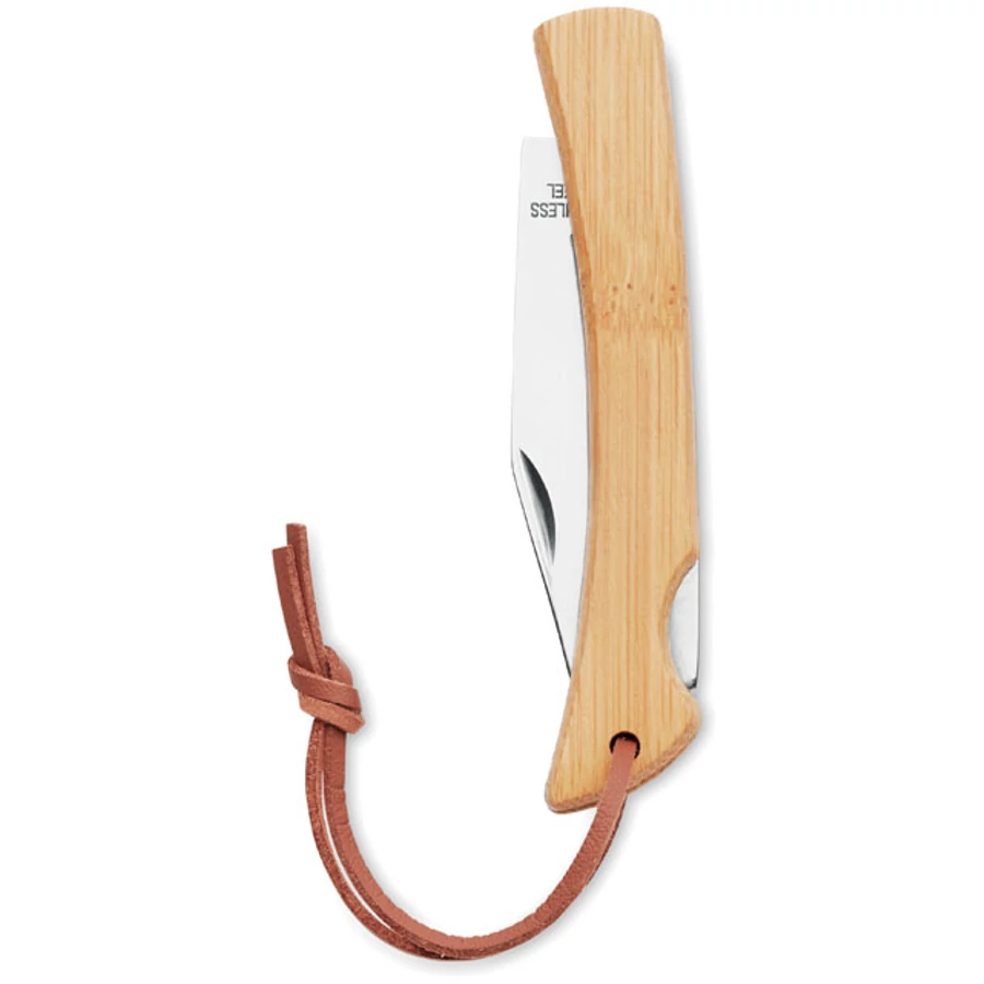 Összecsukható bicska rozsdamentes acélból és bambusz nyélből PU nyélzsinórral