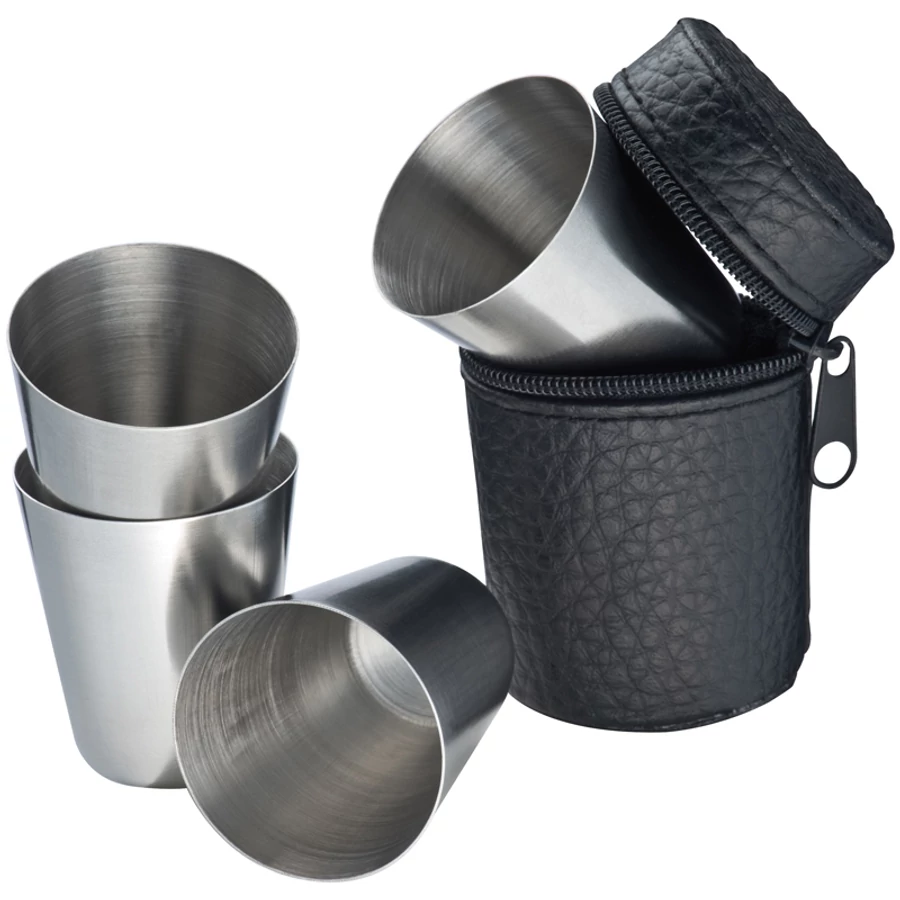 4 darab rozsdamentes acél kupica, fekete műbőr tokban.